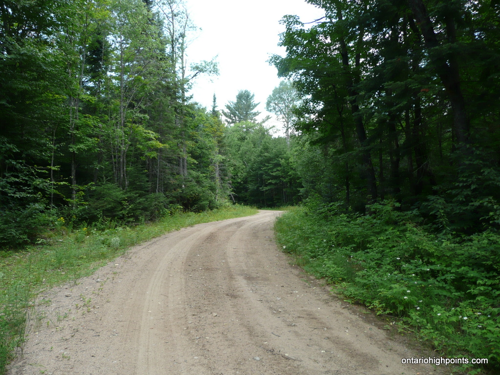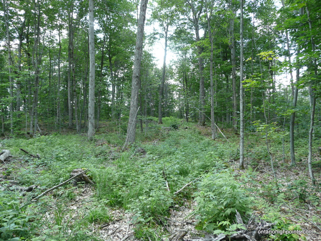 Even though the ATV road was in good condition, I opted to park at the intersection and continue on foot. About 1.4 km from the road, a clearing emerges on the left, connecting a rougher logging road which heads southwest. Take this road for 650 meters. At this point, you can begin bushwhack west for 500 meters. The forest in this area is open with very light underbrush. On my way in, I stayed on the road, which eventually loops south and passes just west of the summit, however the more direct route is to bushwhack.