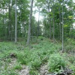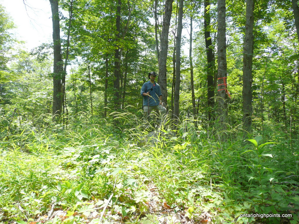 The summit is a fairly flat area with 2 small ridges competing for the highest ground. The area immediately between 2 medium sized boulders appeared to be the highest spot. Trees obscure any possible views.
