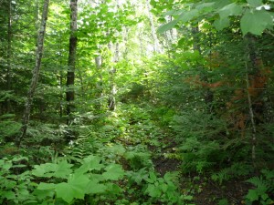 Overgrown single track trail leading to Sawmill Lake