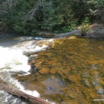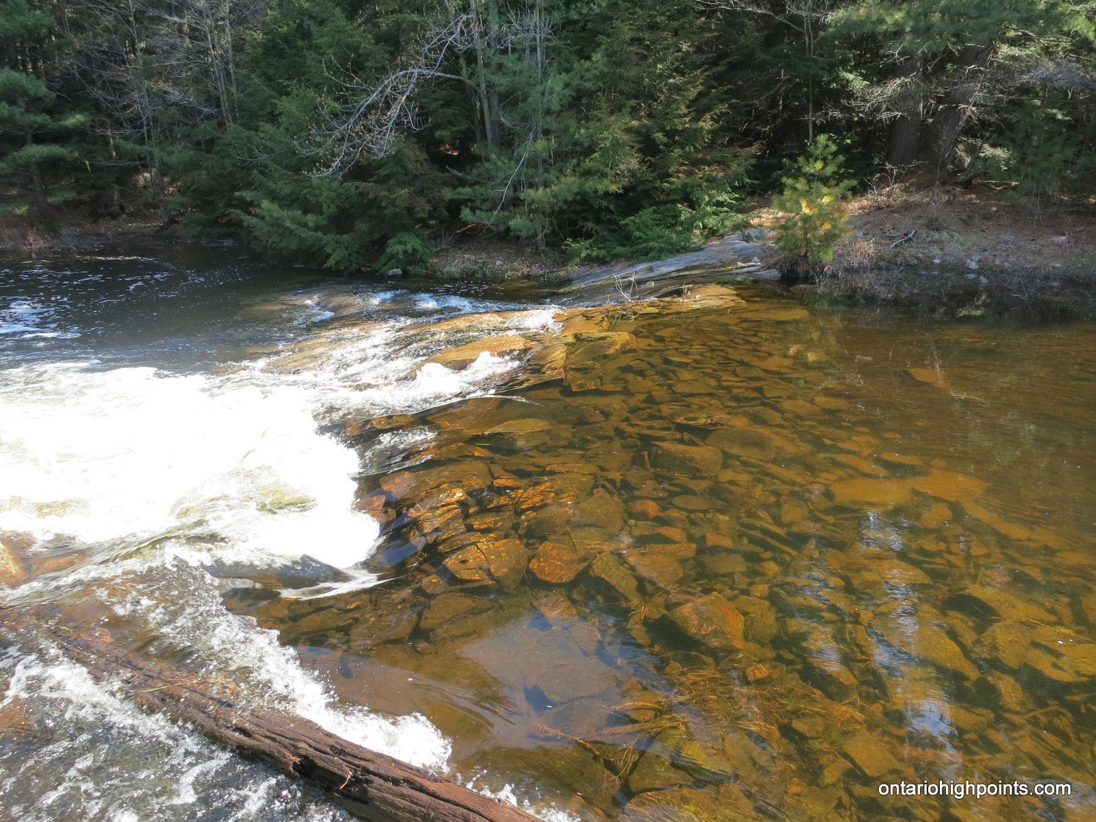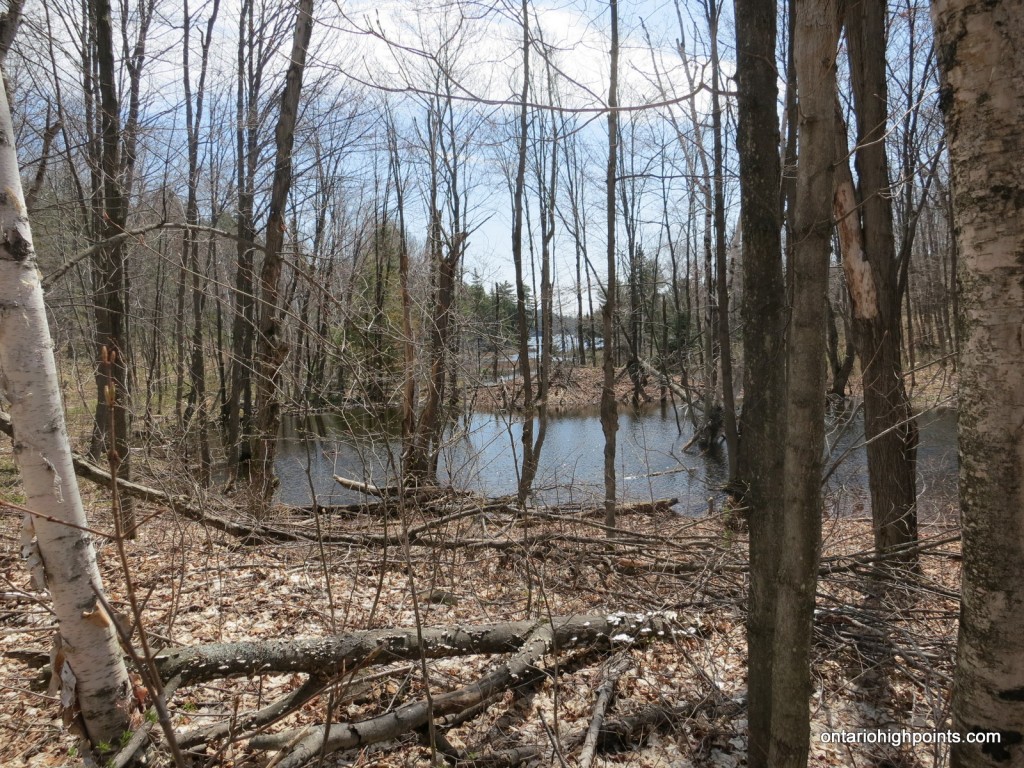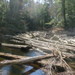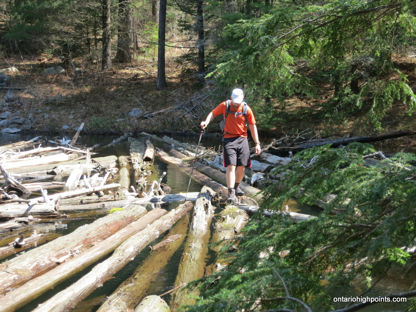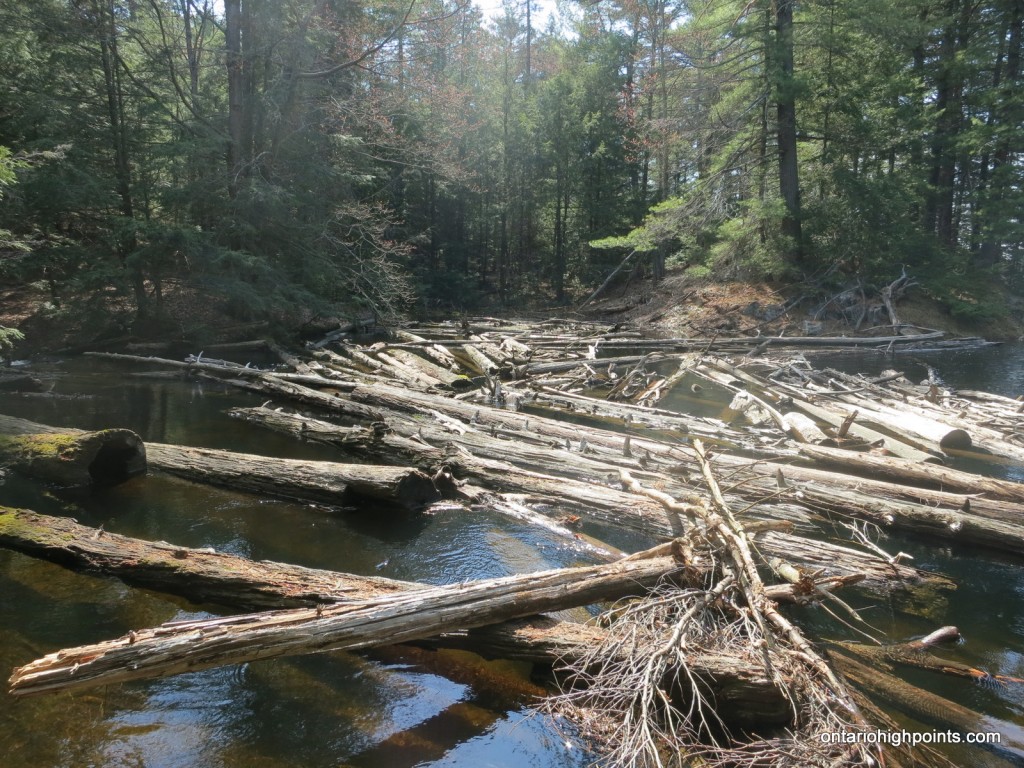 After crossing the portage trail between Bell Lake and Log Boom Lake, you will encounter a second creek, which drains Bell Lake into Log Jam Lake. This creek is wider than the first and can probably be crossed along rocks in low water. In high water conditions, this might not be feasible. An alternate way to cross is along the logs at the log jam at the north end of the creek near Bell Lake. (ontariohighpoints in no way endorses this route as log jams can be unstable and dangerous for crossing)