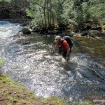 After searching the woods for almost an hour for any sign of an old road, we gave up and headed west. Our first obstacle was a creek draining from Bell Lake. Easily crossed under normal conditions, it was swollen with water from the spring melt and recent rains. In most places the current and rapids made the creek too difficult to cross, but we finally found a spot to ford, between two sets of rapids. We pulled off our boots and prepared to cross. We used my hiking poles to stabilize ourselves against the strong current and made the potentially hazardous ford through the “refreshing” (bone-chillingly cold) spring water.