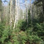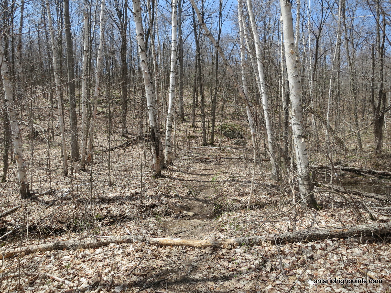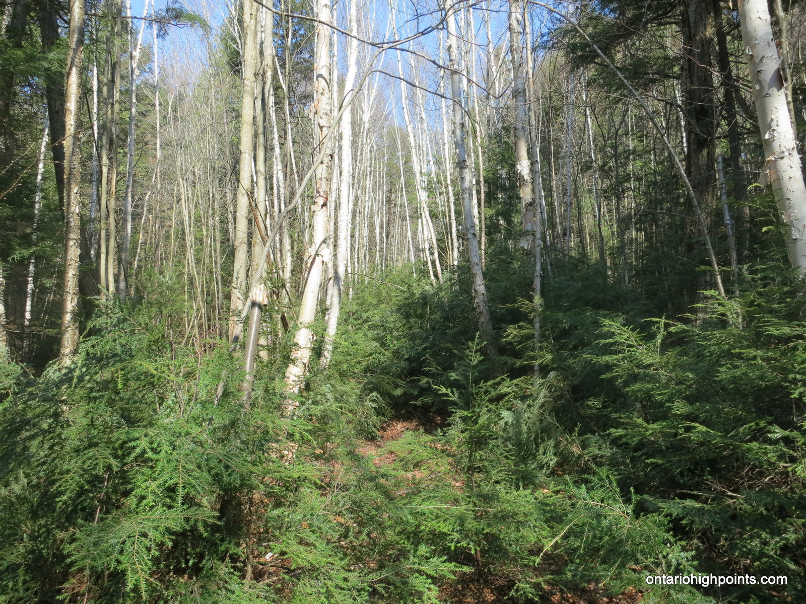 Just beyond the creek, you will intersect with the old logging road, much of it overgrown with young hemlock trees. You can optionally follow the road or bushwhack west through the mostly deciduous forest. Skirt south to avoid a section of blown down trees and continue west to a second creek crossing, which lies 1.9 km away from the first creek.
