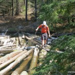 We arrived at another creek which also drained Bell Lake. It was wider and deeper than the previous creek, and with the torrent of water, we couldn’t find a good place to ford. We decided that with some small enhancements, a log jam near the mouth to Bell Lake looked stable enough to cross. Although walking along unstable , partially jammed logs was a bit sketchy and not for the faint of heart, we managed to cross without injury and without getting wet.