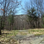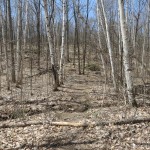 A short distance from the creek, we finally found the old logging road. It was quite overgrown in spots with young, thick hemlock. Against the leafless spring trees, it appeared as a ribbon of green through the forest. We followed it west and encountered occasional flags of surveyors tape, left by a previous traveler. Sometimes the road was too overgrown to pass through, so we often found ourselves bushwhacking alongside the overgrown road, instead of on it.