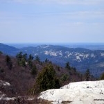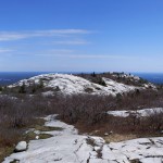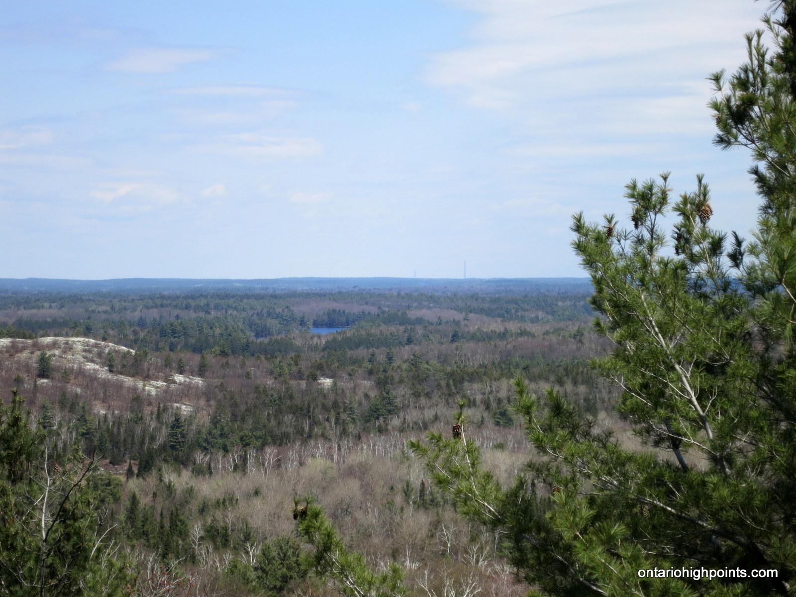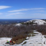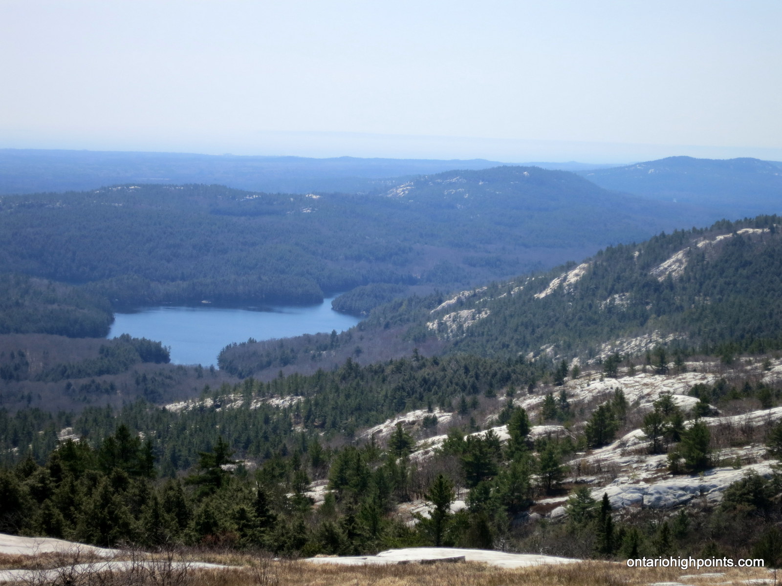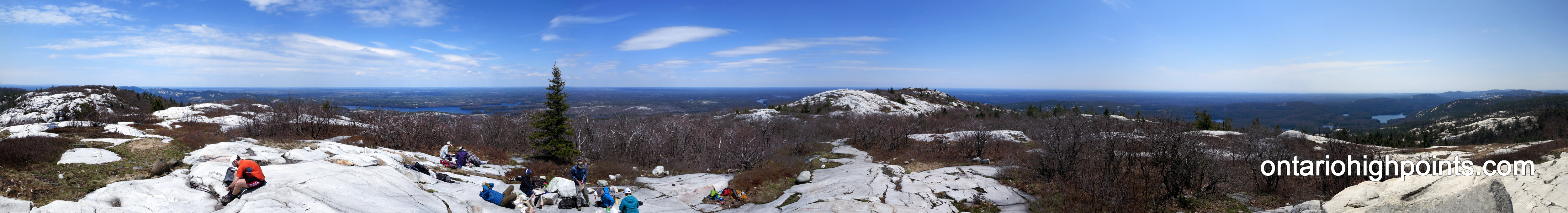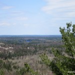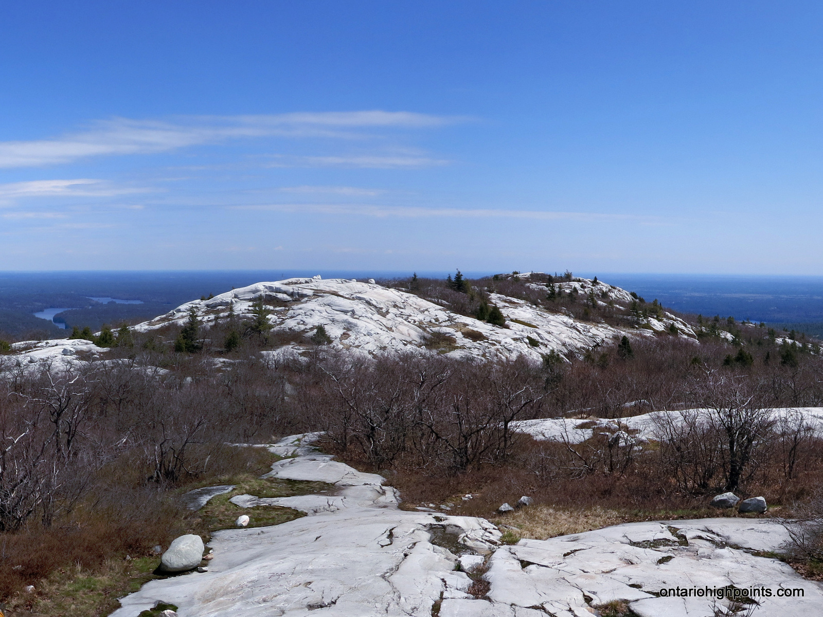 The Silver Peak trail was wide and easy to follow through the still leafless forest. With no water obstacles, we made quick time to where the trail converged with the La Cloche Silhouette trail and followed the trail west. After 1.5 km, we reached the side trail turnoff to Silver Peak. Turning south, we began the ascent up mountain. After passing several groups of hikers, we started to get the impression that we would be sharing the views with many others who were also using their long weekend to climb the peak. As we neared the top, we started to get views of the quartzite rock outcrops of Silver Peak Range and also views north towards Sudbury which was faint in the distance.
