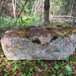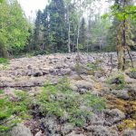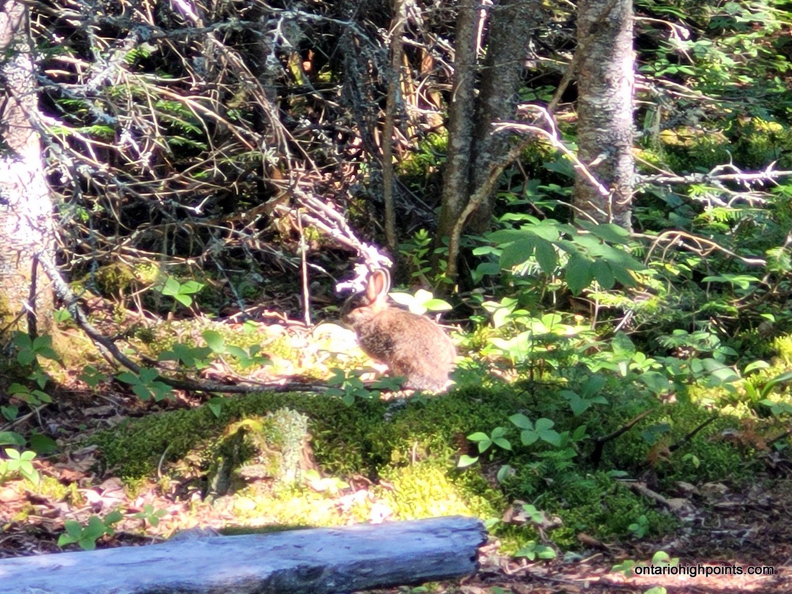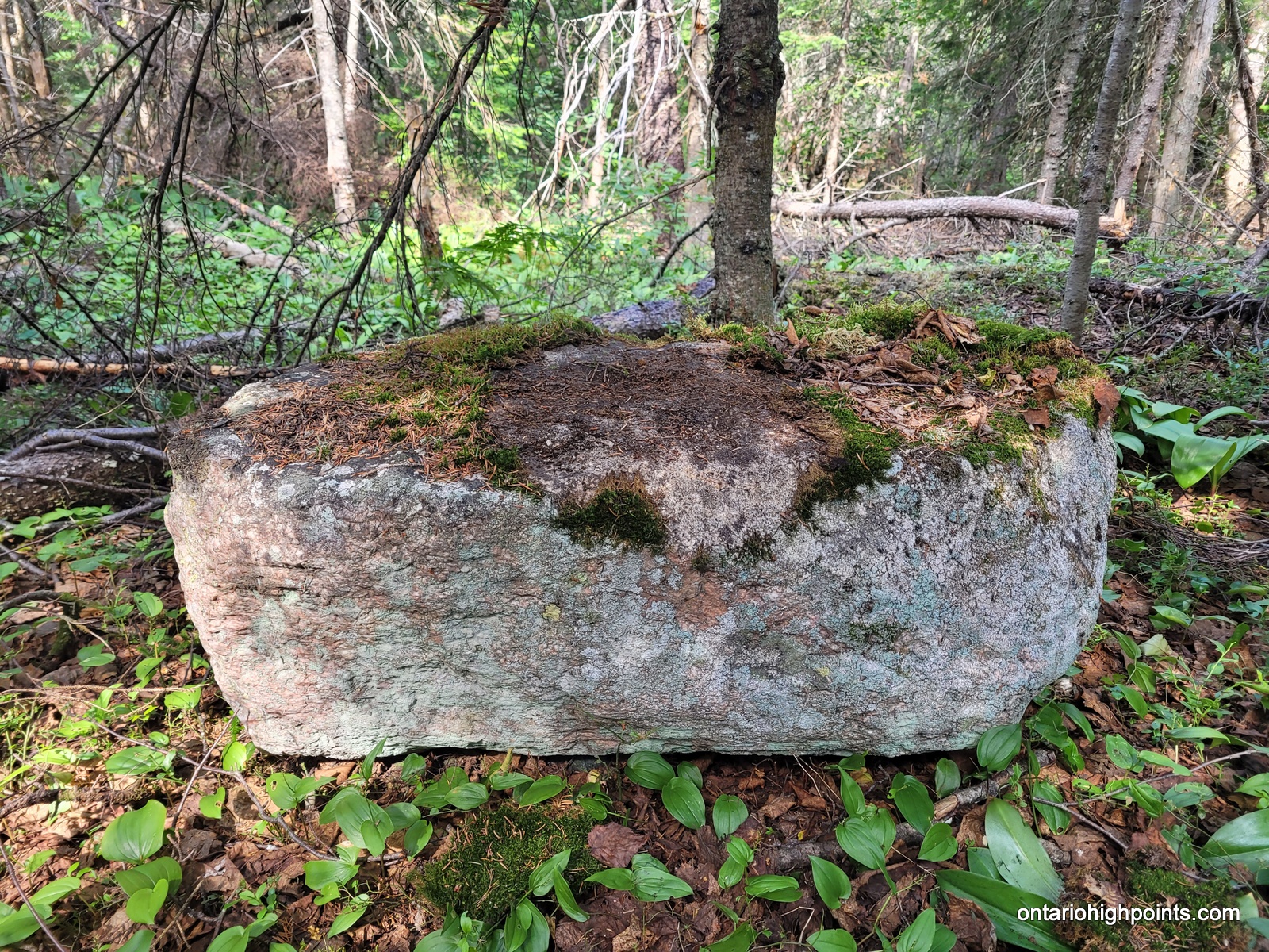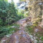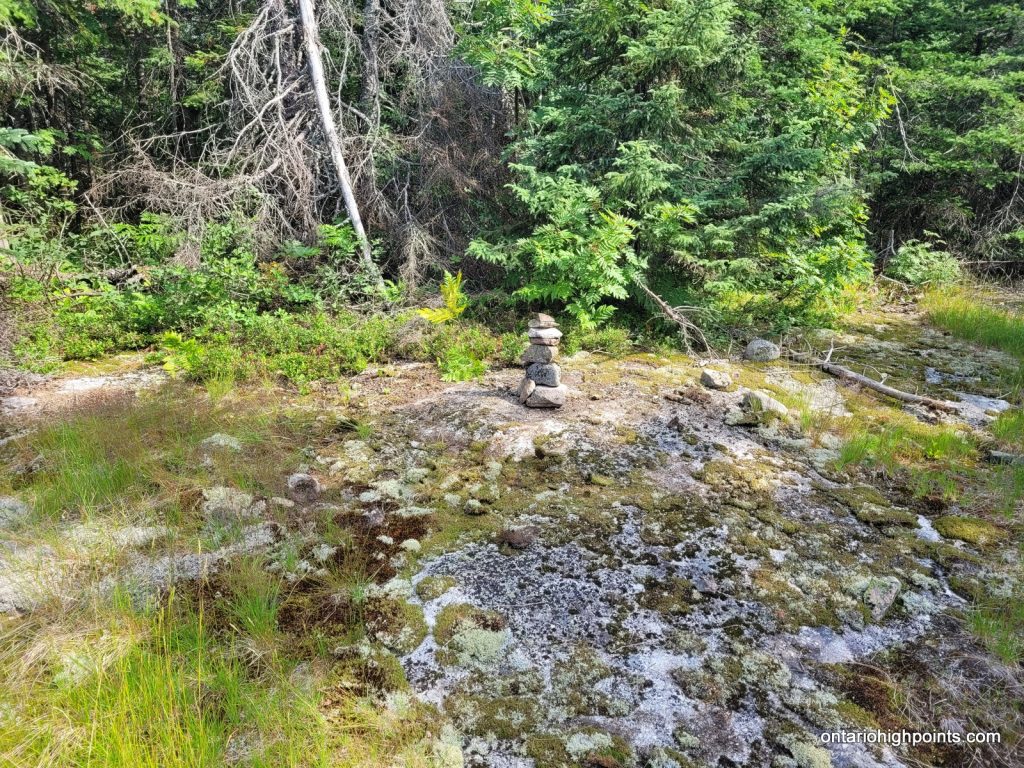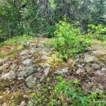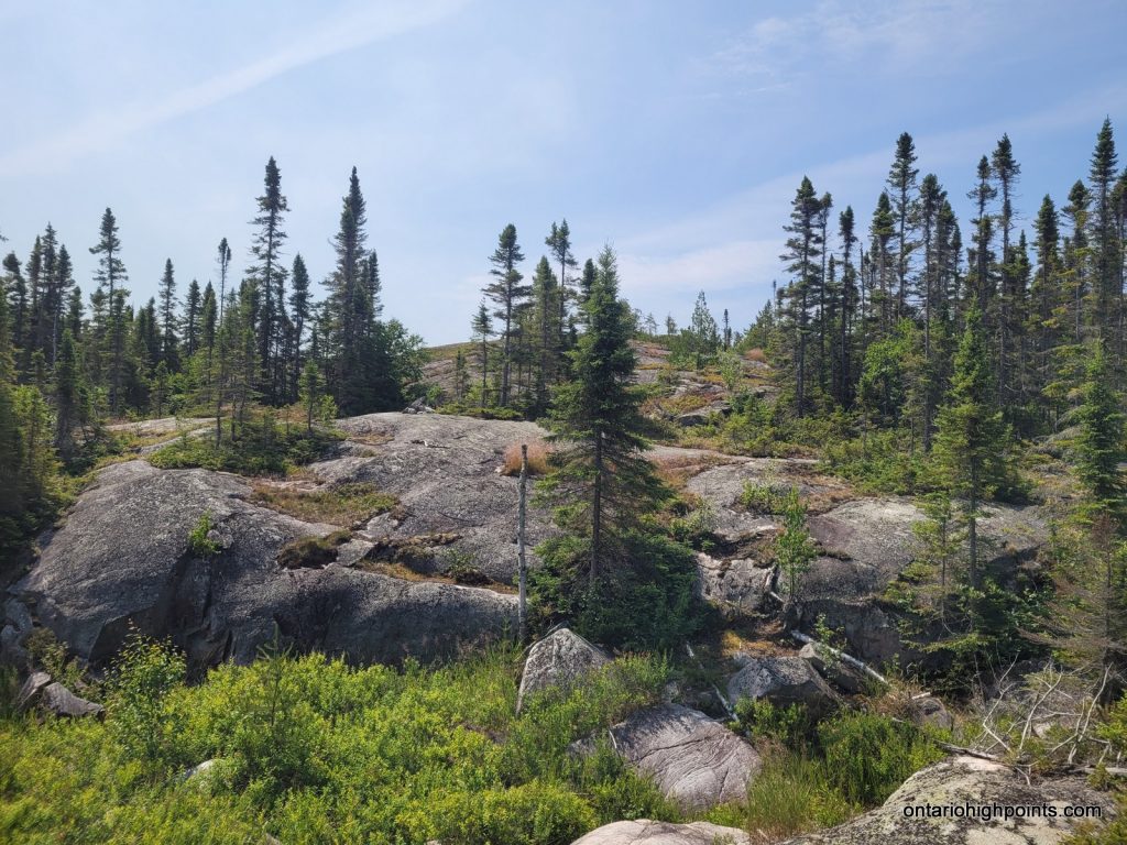We reached the summit at 10:30 AM. There is a small rocky clearing at the summit but no views here as the summit is mostly forested. I set out to explore the summit area as it is a large area and I wanted to make sure I found the actual high point. I found a couple of candidate high points. There were a couple of boulders near the official summit coordinates and then 2 rock outcrops 50 and 70 meters northwest. I’m fairly sure one of these 4 is the highest point. At the official summit coordinates, I found some rusty metal spikes, evidence of a previous visitor, perhaps a surveyor.