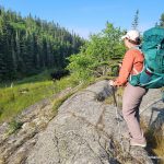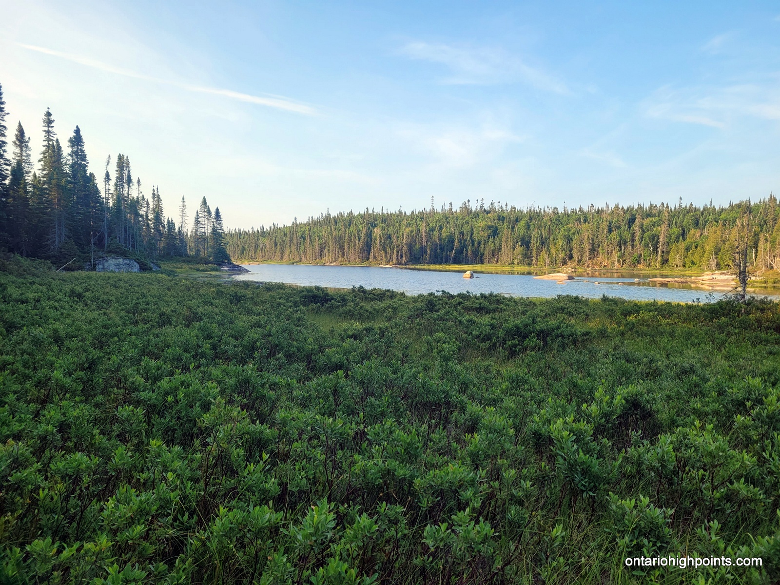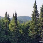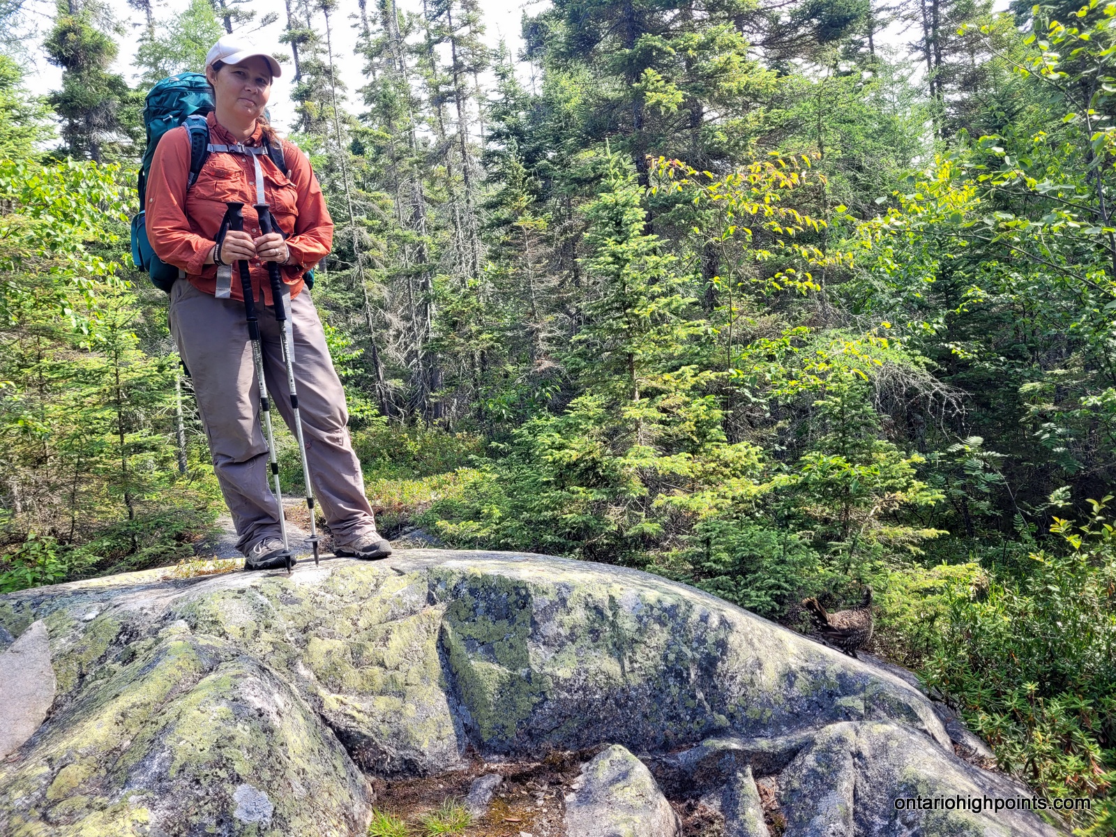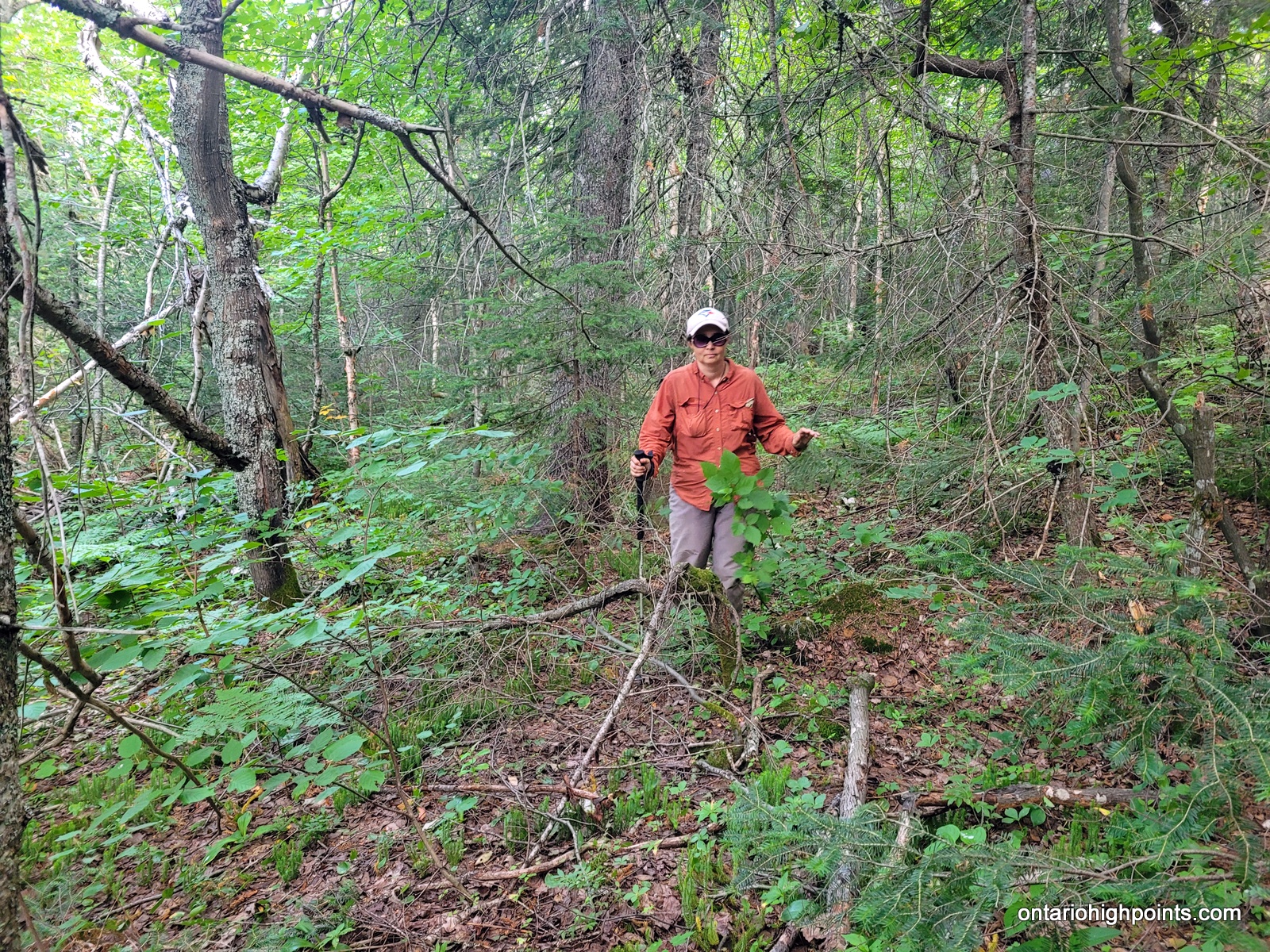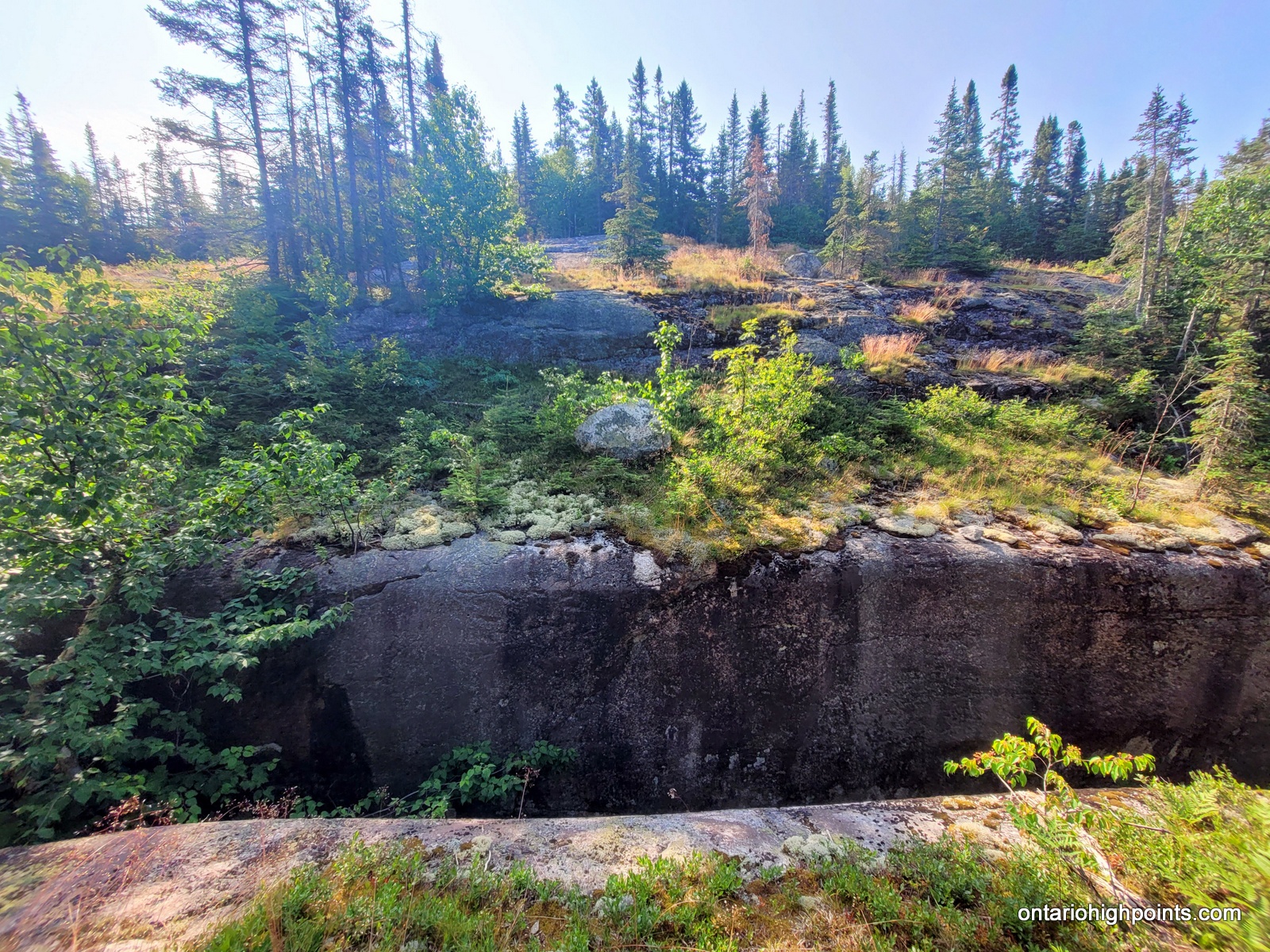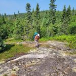 Summit day! Today we would only need to carry the bare essentials as we would be returning to our campsite. Val had the day off carrying a pack, and I carried enough water for both of us (4 liters). We departed our campsite at 7:15 AM and bushwhacked southeast traversing along the steep slopes near the pond. Bushwhacking along the slopes was difficult as the fir and spruce trees were tightly spaced, but after moving out to more level ground I found that the bushwhacking was fairly typical for Northern Ontario — similar to other bushwhacks in Northern Algoma.