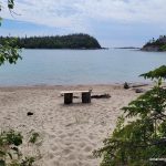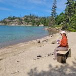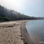 Once we arrived at our campsite; WSH1, we strung a clothesline and hung some of our clothes to air out. We lounged on the beach and had our lunch. There were large cut logs and some boards that made a nice bench to sit on, both at the beach and at the fire pit at the campsite. We also went back to the blueberry patch along the trail and picked some more blueberries and then gathered firewood for tonight’s fire. It was a very nice, scenic campsite, and the wind kept the bugs away.