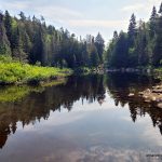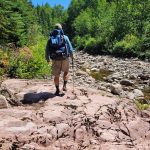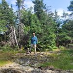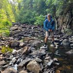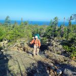 At the White Gravel River, we departed the Coastal Trail and followed the river for 1.3 km and then turned onto a tributary (creek) of the river and followed it for 9.1 km. The White Gravel River is considered a spring river, which has significant water flow in the spring, but little more than a trickle in the summer. After navigating around a series of ponds, we departed the White Gravel River tributary and bushwhacked overland for 1.5 km to a large beaver pond where we made camp. From that camp we spent a day bushwhacking to and from Tip Top Mountain (5.5 km each way). We returned via the same route back to the Coastal Trail, and then opted to take the water shuttle which picked us up from White Spruce Harbour (which is about 3 km south of White Gravel River) and dropped us off at Hattie Cove.