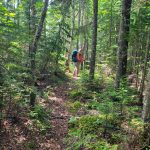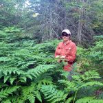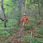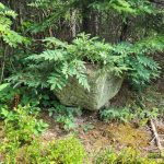 Beyond our pond, we paralleled a line of lakes (which are headwaters of the North Swallow River) and then headed southeast towards the Tip Top Mountain ridgeline. There were many fern groves along the route which we were able to take advantage of for ease of passage. The forest is mostly a mixed deciduous-coniferous boreal forest — we bushwhacked under a canopy of mostly birch and fir trees.