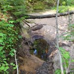 We broke camp at 7:15 AM and began our return trip back to the Coastal Trail. I changed up the bushwhack route a bit and followed a more direct path heading north along the creek flowing out (not much flow) from our pond. We paralleled a steep gully and descended down to a grassy marsh and then back to the beaver pond at the White Gravel River tributary/creek. Once back at the creek, we crossed the beaver dam and turned west and followed creek down.