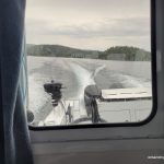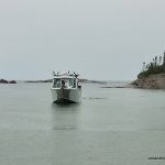 It stormed during the night — lots of rain, thunder and lightning. We woke up early to break camp and wait for the water shuttle. It was drizzling all morning and the tent was packed up wet. The boat was a bit late but we were happy to see it appear around the rocky point and motor into the harbour (10:10 AM). It eased up as it neared the beach and we were welcomed aboard by Captain Brian. Val and I climbed a ladder to get on deck and then found a seat in the cabin. A short time later, we were off, and heading north up the coast. Brian turned into a bay and then cautiously through the narrow passageway into Hattie Cove. At 11:10 AM, we were dropped off at the dock at the Pukaskwa visitor’s center.