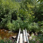 Turn left (east) at the T-Junction and follow the overgrown path, turn left at the fork at kilometer 9.0 and cross the makeshift ladder-bridge at kilometer 9.4. In 100 meters, the road becomes completely overgrown and unrecognizable. This is the start of the bushwhack (kilometer 9.5).