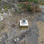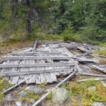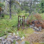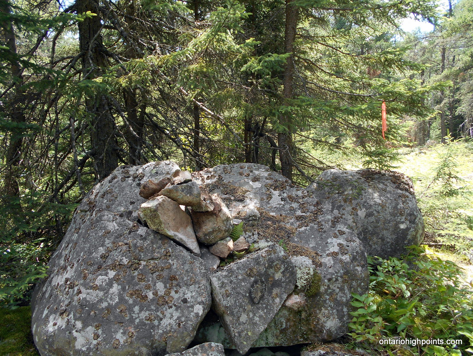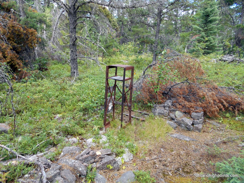 Set a compass course 105 degrees (true north) and bushwhack 450 meters up rugged terrain through thick bush, which eventually gives way to open forest with lots of dead fall. Stay to the north of the talus field and cliffs and begin the steep scramble up to the summit plateau. Once reaching the top of the summit plateau, change compass course to 140 degrees and make the final 350 meter bushwhack to the tower debris field. As Tower Mt. is a very broad and flat summit, there are multiple candidate high points and it’s hard to ascertain which is the highest. There are at least 2 high point candidates, the first near the tower debris at N48 18.448 W90 05.674, and a second at N48 18.511 W90 05.610.