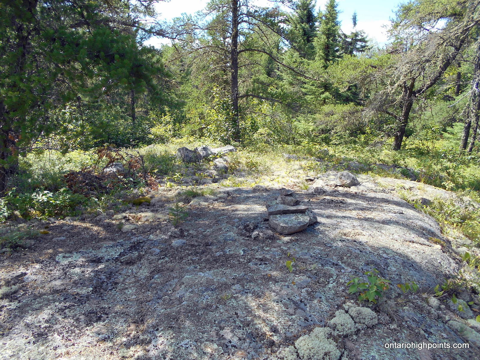 Once reaching the top of the flat summit plateau, the forest was more open. We headed to 3 possible summit candidates that I had identified on my maps. The first candidate (labelled as High Point Candidate 2) was about 100 meters north of the fire tower debris, the second candidate (which we discounted as being lower than High Point Candidate 1) at the fire tower debris and the third candidate (labelled as High Point Candidate 1) just 50 meters southwest of the tower debris.