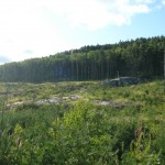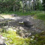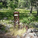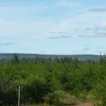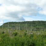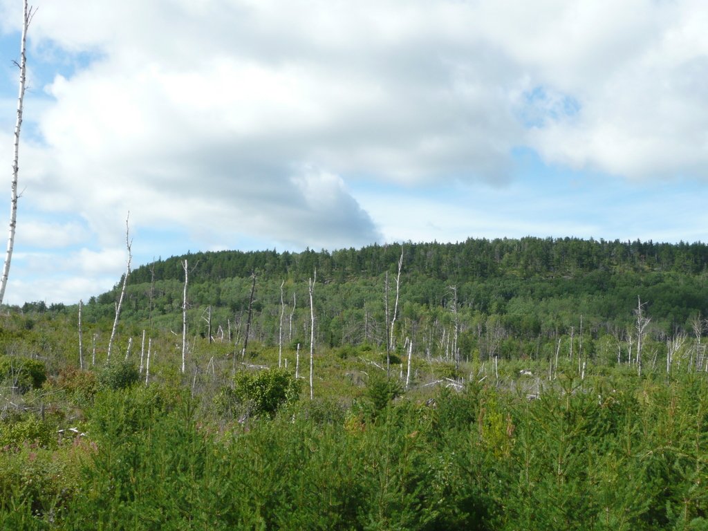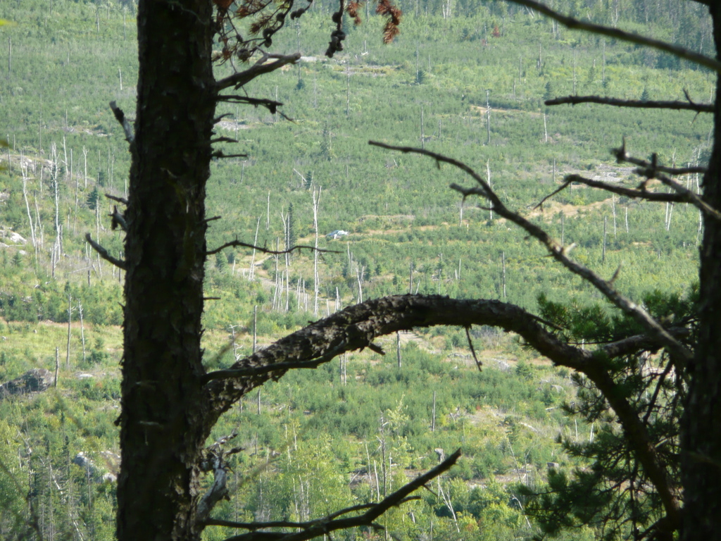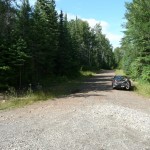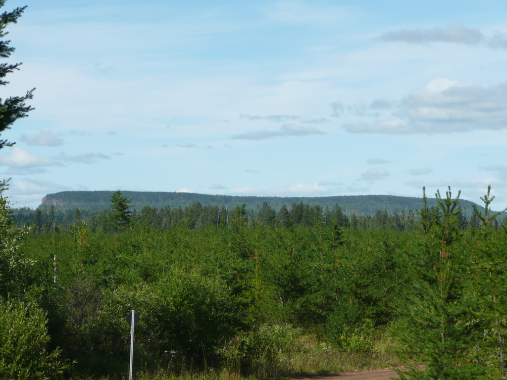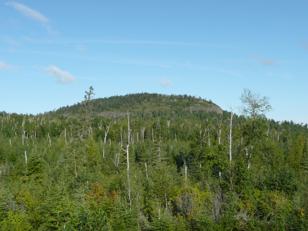 This road is a bit rough, with large potholes and short, steep, bouldery hills in a couple places, but most passenger cars should be able to make it with just a few undercarriage scrapes. This road was not marked on any available maps. Follow it for 12.3 km from Route 588, through massive clear-cuts. The open terrain provides a good view of Tower Mountain while approaching it –it looks impressive, a large prominent ridge with steep cliffs guarding its southwest slopes. The road goes almost to its base and turns right. Depending on the vehicle, one could drive right to the start of the bushwhack near WGS84 N48 18.274 W90 05.107, just before the road starts a steep, rocky descent. There is also a good place to park at WGS84 N48 17.832 W90 05.372, just before the road starts getting a little rough for a 2-wheel drive passenger car, about 1.5 km from the start of the bushwhack.