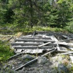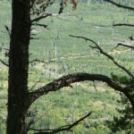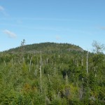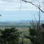 The peak is a broad, flat-topped ridge, with steep slopes and cliffs surrounding the central plateau. The summit is a very broad flat area, and it is marked by clearings with lots of debris from an old tower. You can see the tower footings, the wreckage of the wooden observation box, old cables, and electrical junk lying around. A rise to the north of the tower area may be the actual highpoint, but it’s hard to tell. There are no views, but if you bushwhack to the west for a tenth of a mile you will come to the top of the cliffs, where a nice vista of clear-cut forests extends for miles.