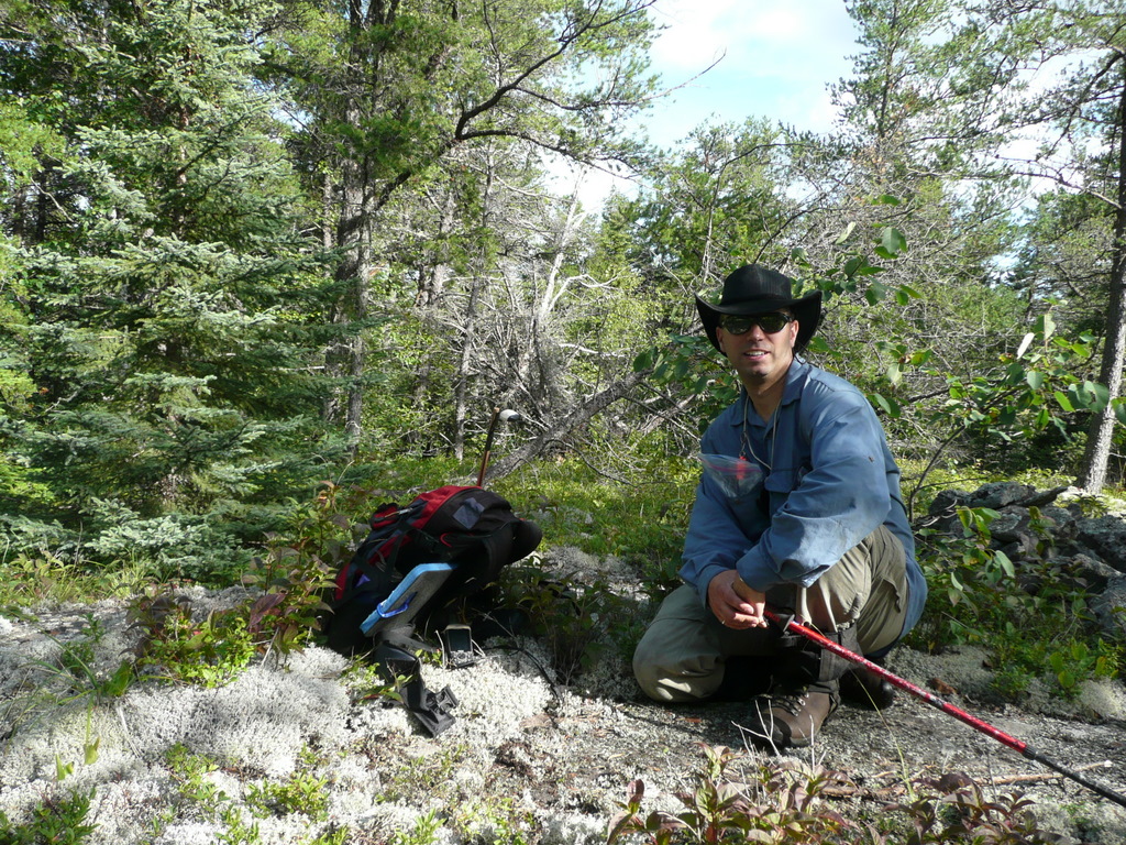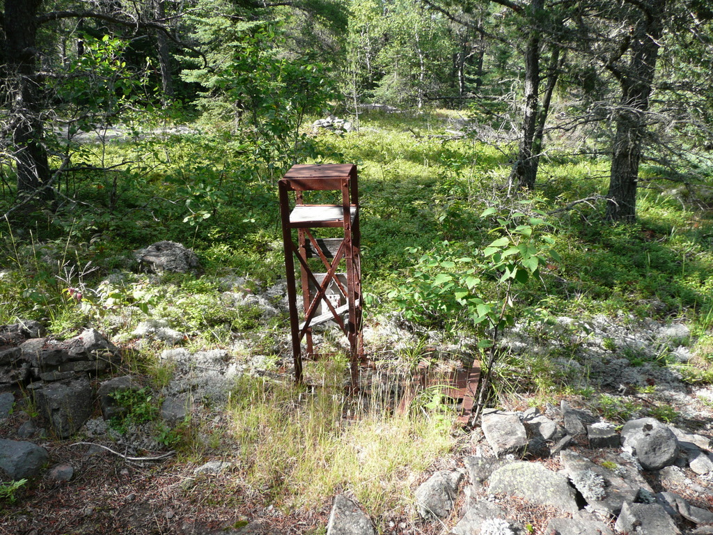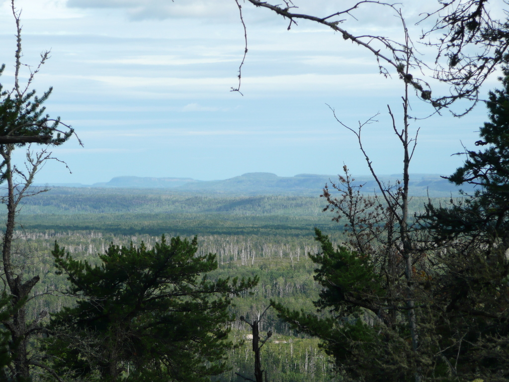 From here it is an 1.1 km bushwhack north-northwest up the slope to the summit. If you go too far west, you will encounter brushy cliffs, so it is best to stay right when in doubt. After a short, steep stretch you will gain the flatter terrain at the top of the ridge, where you head west-northwest towards the summit. There is no sign of the trail on the topo map (or any trail at all), but the bushwhacking is not too bad since the underbrush is thin on top of the ridge. The highest point is in question as the summit is broad and flat, however a couple of coordinates have been suggested: WGS84 N48 18.444 W90 05.667 (My GPS indicated this was 30 feet higher) and north of this WGS84 N48 18.481 W90 05.666.