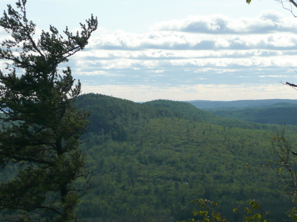 As I conquered the cliff wall, I noticed that I had reached the top of the ridge. The terrain leveled out and the forest thinned, making my progress easier and more enjoyable. I walked along the top of the cliffs and enjoyed the partial views south, back where I had come from. Eventually at WGS84 N48 18.367 W90 05.479 I decided to head northwest towards the summit, traversing moss covered rock ledges and fern and juniper matted patches.