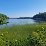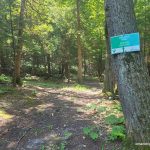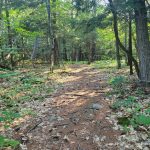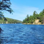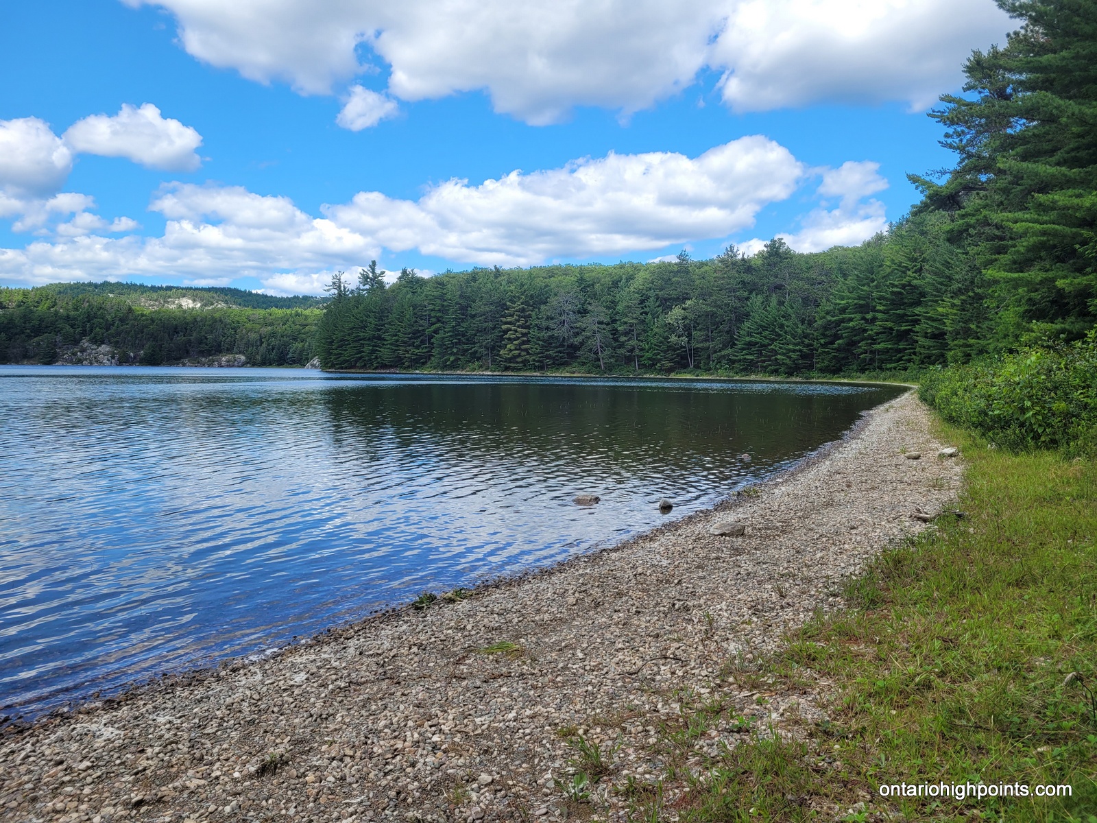 East of Wright’s Lake, the trail becomes significantly easier to follow, it is well marked and the path is much more defined. I broke camp and set out at 6:50 AM and began a moderate ascent up the ridgeline. A lot of the trail through this section is through maple, white pine and hemlock forests, but there are a few places with views along the route — a high point with a view at N46.10814030, W81.85941223. Beyond this point, the trail heads northeast and then parallels the south shore of Alexander Lake. There is no access to the lake until reaching the east end (it’s a steep drop down to the lake).