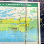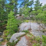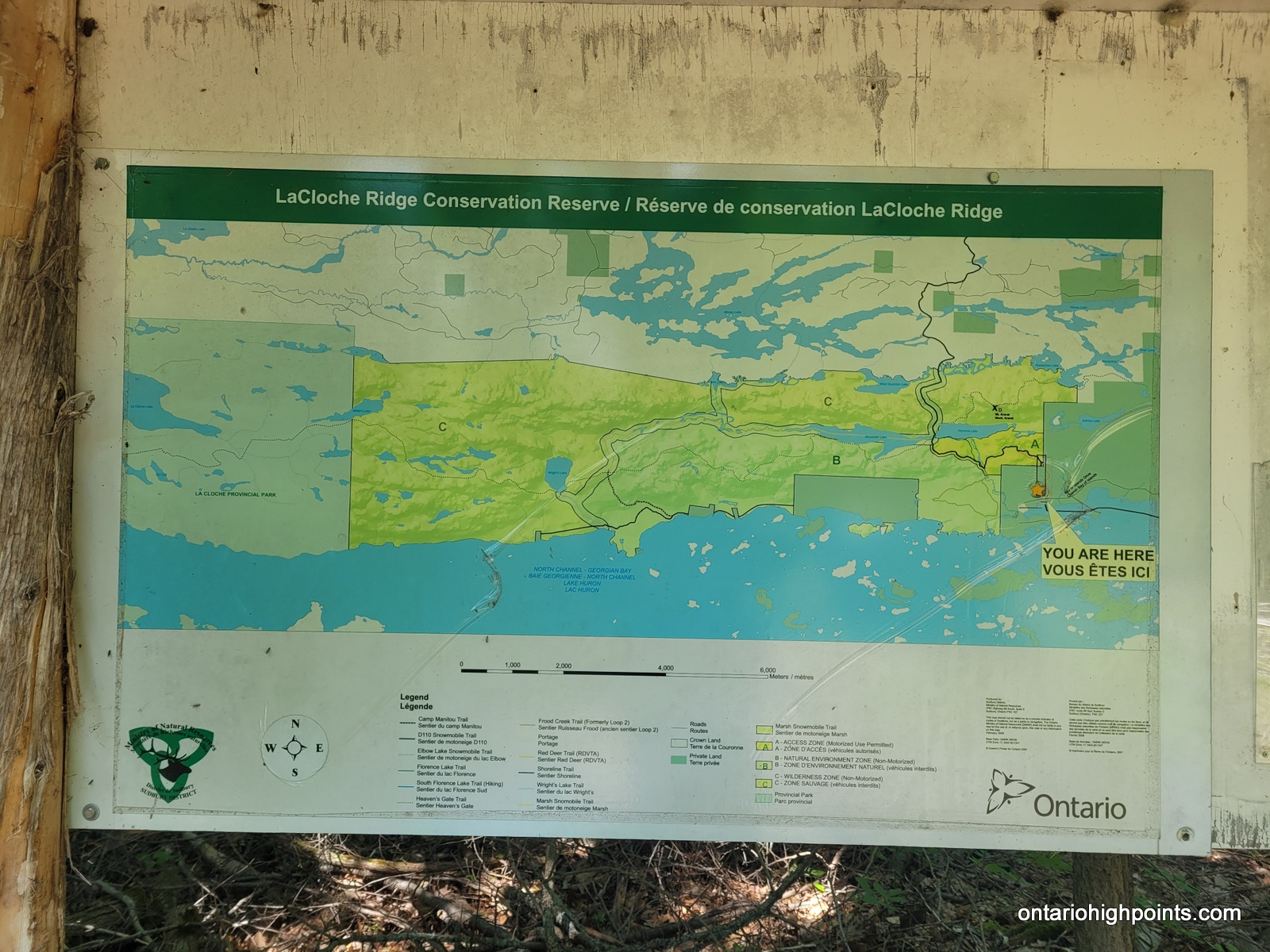 The trail starts at the bridge that crosses over the La Cloche River. Initially the trail is flat, easy to follow and well marked with plastic white blazes and orange tape. However after about 1.5 km, and as the trail begins to climb up the rocky ridgelines it becomes much more rugged and difficult to follow. Expect to lose the trail multiple times and have to backtrack to find it. Having a GPS with the trail downloaded on it would be a huge benefit.