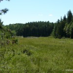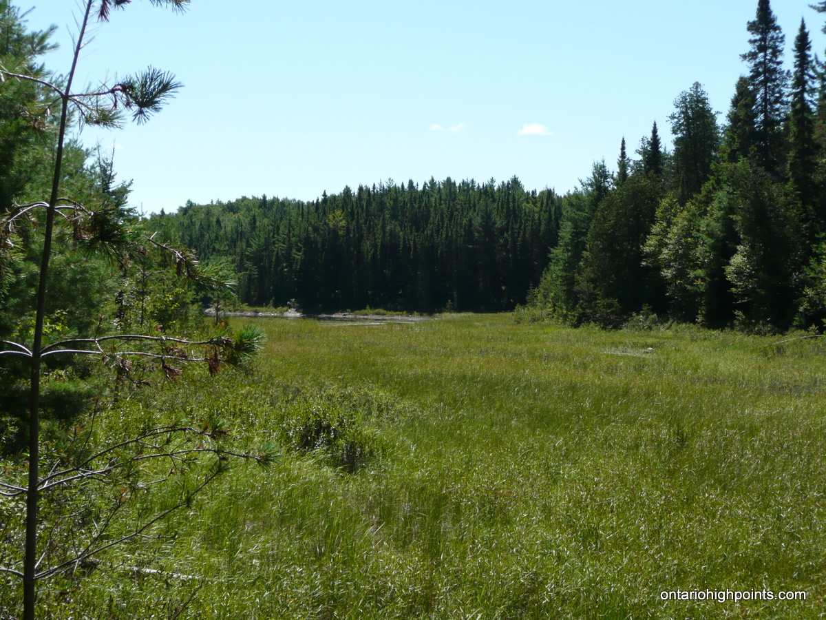After an initial steep ascent up through hardwood forest, the route flattened out and gradually descended towards a small and easily crossed creek. The forest transitioned to thicker mixed coniferous/deciduous forest which made for more difficult passage. After another 30 minutes, the thick bush gave way to a clearing/marsh which occupied the northern edge of a small lake. We paused for a short break at the edge of the clearing and enjoyed the warm and sunny weather.