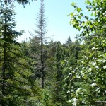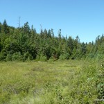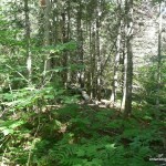 The marsh, although wet and muddy in spots was not hard to cross. At the western edge, we encountered a small stream which we were able to cross atop a fallen tree. We reached the western edge of the clearing and plunged back into the bush where we began an ascent up another hill. After a short bushwhack through mixed forests, we arrived at a second clearing with a marsh. Again, this marsh was not too wet and we were able to cross it fairly easily. A creek ran along it’s western edge which we were able to jump across without much difficulty. From this point onwards, the bushwhack was a moderate ascent up to Witchdoctor Peak.