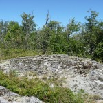 Click here for directions from Sudbury to nearby Gravel Lake. From Gravel Lake, follow Domtar Road west until reaching the junction with Laughing Lake Road, 1.8 km past Gravel Lake. Keep right on Domtar road which travels northwest along the shore of Tujak Lake. When the road veers right, 7.8 km from the junction with Laughing Lake road, park at the small pull off at the start of an ATV trail. From this parking area, it is a 3.0 km (as the crow flies) bushwhack westward – 256 degrees magnetic heading to the summit of Witchdoctor Lake Peak. The bushwhack begins steeply but then flattens out and passes through deciduous and then mixed forest. 1.3 km from the parking area, you will pass by the northern edge of a marsh which must be crossed. There is another marsh crossing 500 meters beyond, 1.8 km from the parking area. After the 2nd marsh, the route climbs slightly until reaching the partially open summit of Witchdoctor Peak, 3.0 km. The highest point is atop a moss covered bald rocky ledge. There are partial views to the west about 50 meters west of the summit.